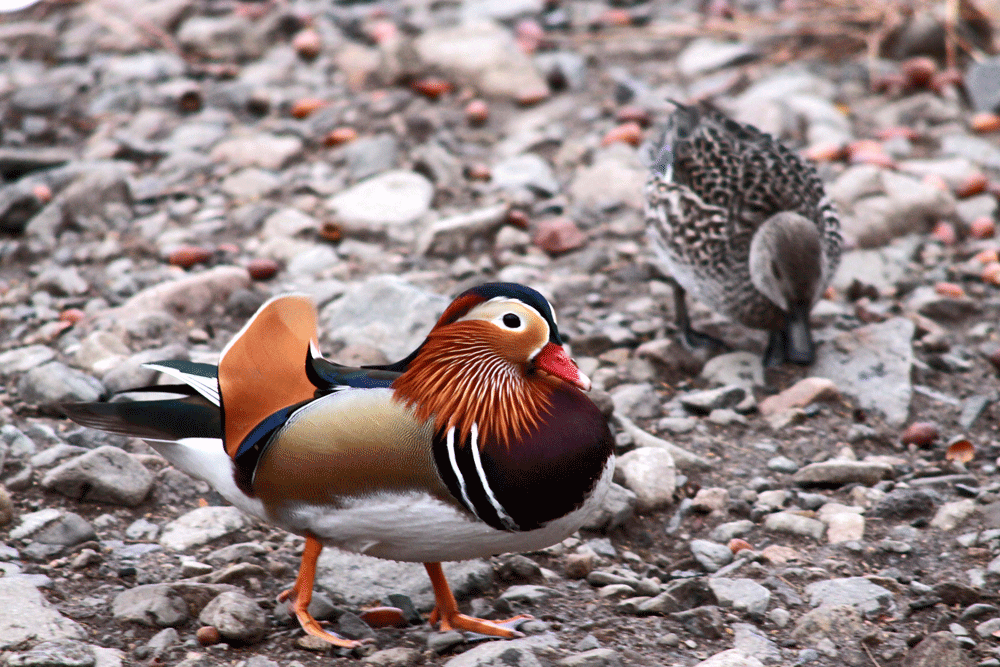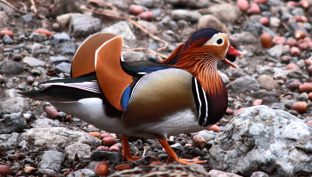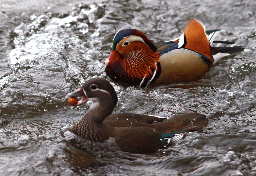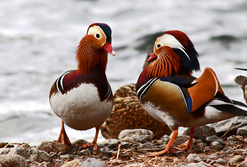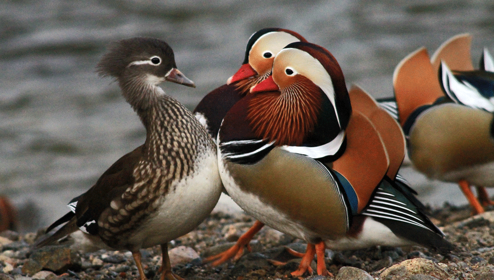 オシドリの雄は華やかな羽で飾り立ている